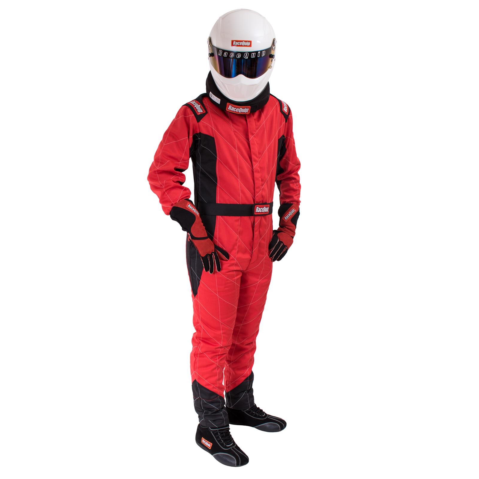 The RaceQuip 9160 series Chevron-5 multi-layer SFI-5 racecar driver’s fire suit is made up of an outer layer of durable Nomex® and a soft, comfortable and lightweight Nomex® liner with Chevron pattern box quilting. The stylish modern Euro design is accentuated with black trim Euro epaulets, a two-piece adjustable belt and black side panels. The side panels feature knit stretch panels for flexibility in the torso and the 180° floating arm gussets increase flexibility in the arms. A stretch panel in the back at the waistline keeps the suit cinched for a custom fitted look. Cuffs are black Nomex® with a boot cuff leg trimmed in black. The Chevron-5 suits feature a high quality, heavy duty Nomex® backed brass, two-way zipper installed with a double overlap for a more secure front opening. Internal bag pockets are included for convenience. Exceeds SFI 3.2A/5 specs. Available in Black, Red or Blue with Black accents. Manufactured in sizes Small – 3X-Large (refer to sizing chart). Note that sometimes these materials are referred to as “fireproof”, but actually all auto racing safety gear is “fire retardant”.