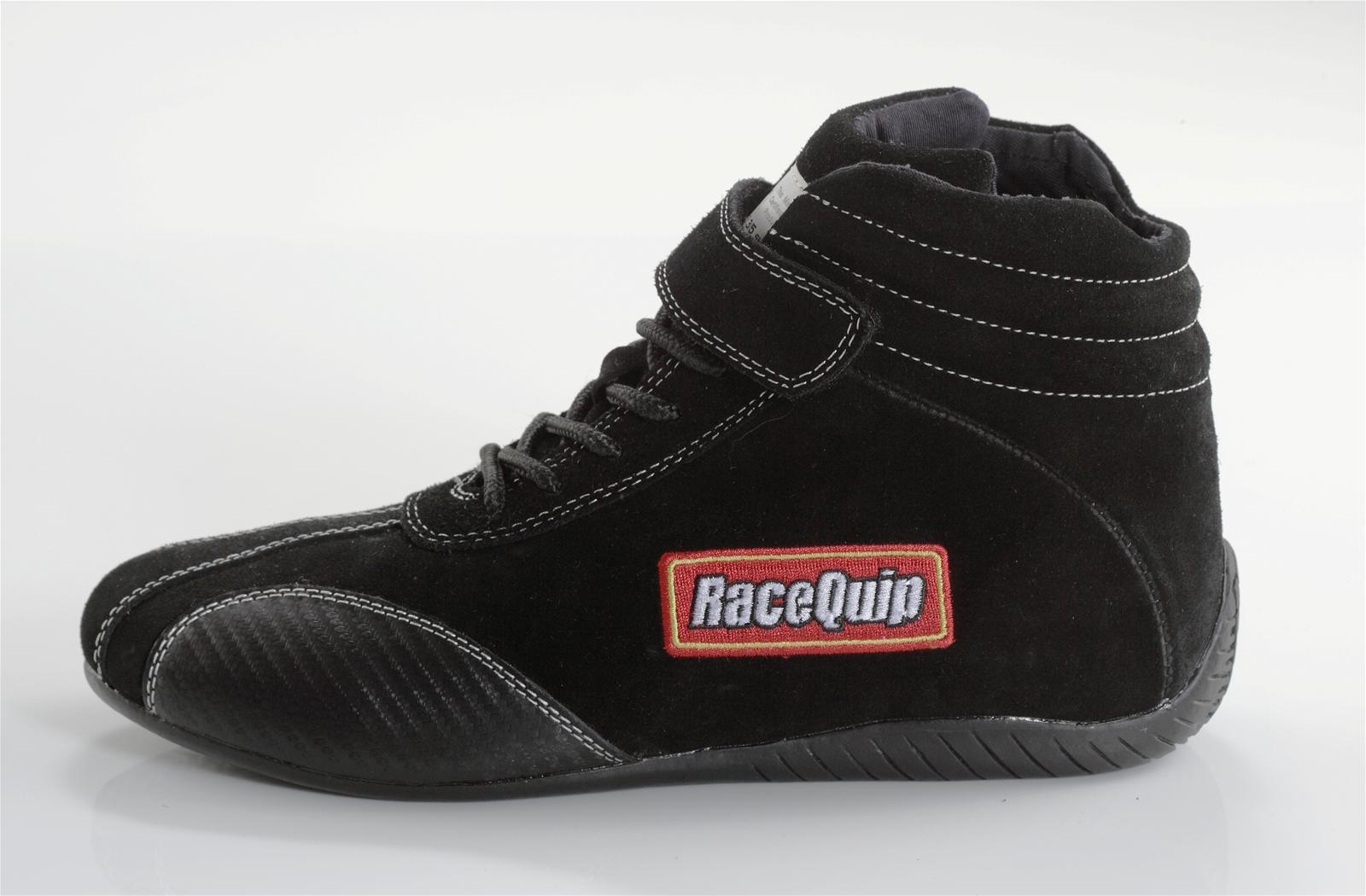 The RaceQuip Euro Carbon-L SFI-5 Racing Shoe has all the features you’d expect to find in a shoe costing much more. This lightweight flexible design incorporates durable construction features like a reinforced lace, toe, and heel area as well as double-stitched seams. The high traction molded flexible rubber sole rolls up the back of the shoe to provide extra support for your heel while driving. The design also utilizes RaceQuip’s unique Achilles flex opening in the back to allow easy foot extension. RaceQuip has added Carbon-L wear pads on both sides of the toe for added protection and durability in the high heat/high wear areas. These race driving shoes feature a soft suede leather outer layer that uses contrasting stitching and European styling to give the shoe a unique look. The liner is constructed of flame retardant Pyrovatex® and has additional padding at the ankles. The internal arch support is not found in many motorsports shoes but greatly increases the comfort when wearing for an extended period. Weighing about 30% less than comparable auto racing shoes, this design perfectly blends light weight, durability, comfort and pedal feel. Exceeds SFI 3.3A/5 rating. Available in black in mens sizes from 1-20.