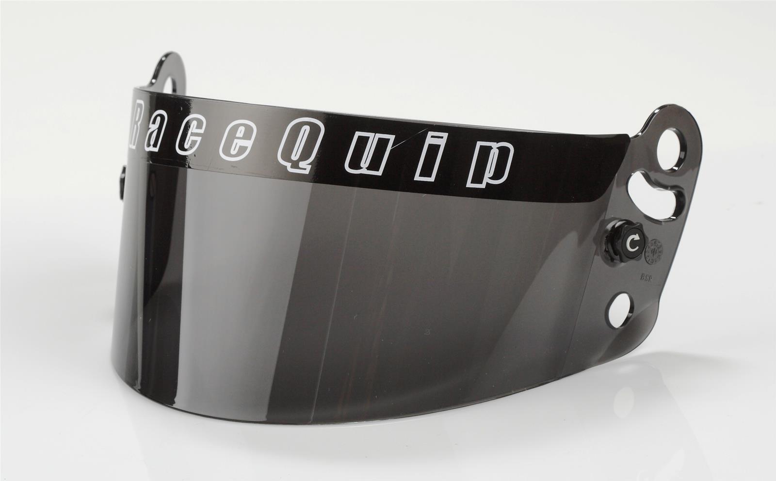 ‘This dark smoke tint polycarbonate faceshield is designed to fit RaceQuip PRO SA-2010 and SA-2015 Helmets as well as SFI-24.1-2010 and 2015 Youth Series Helmets. RaceQuip faceshields (sometimes called helmet visors) are formed from 3mm thick distortion free high strength polycarbonate. A Visor Strip and Tear-Off Posts are included. RaceQuip offers several different helmet face shields to meet any racing conditions you may encounter, from standard clear replacements to dark smoke tint, mirror or blue irridium for bright sunlight conditions, and amber for nighttime racing. All shields are distortion free high strength 3mm polycarbonate and include a visor strip and tear off posts.