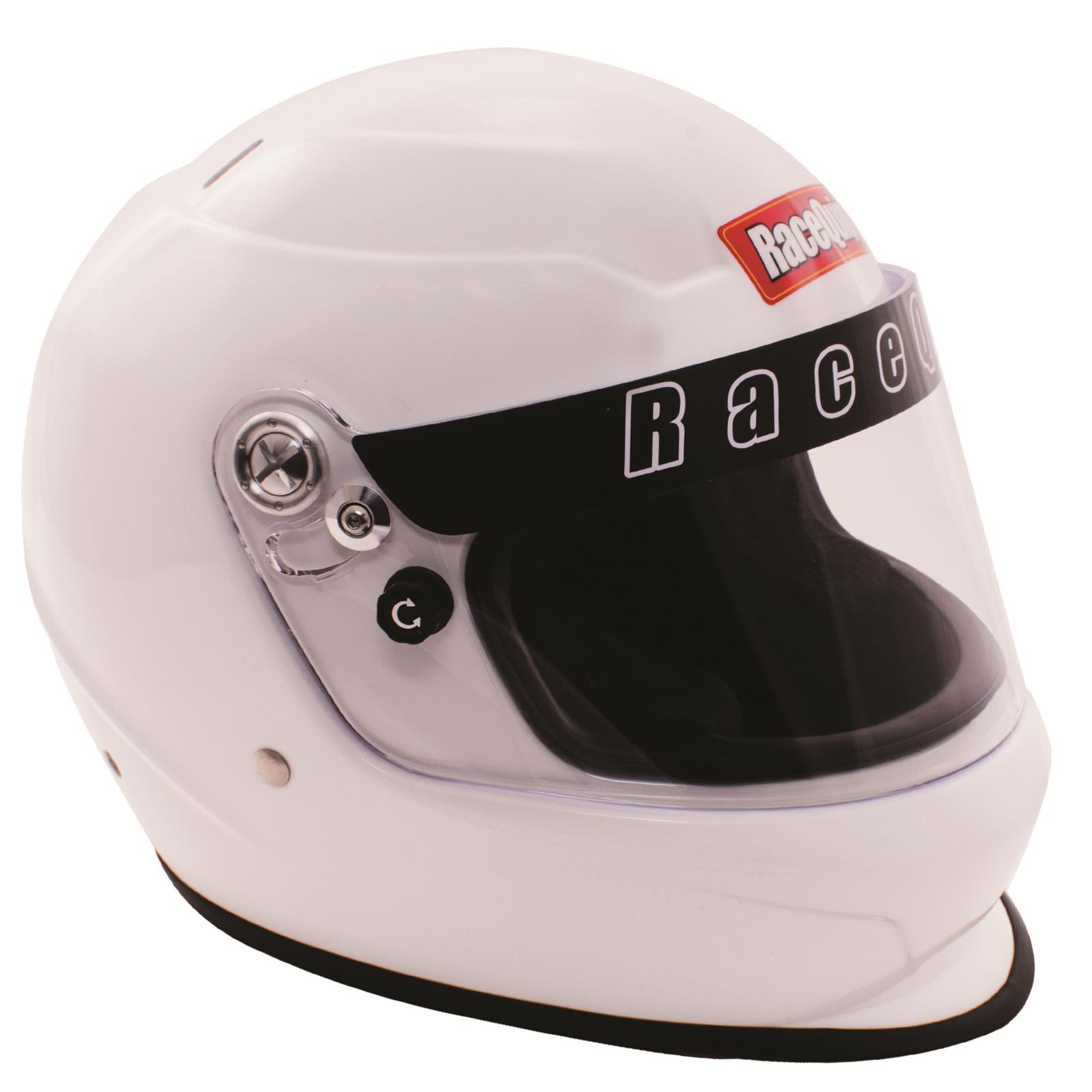 The RaceQuip PRO Youth Helmet is an SFI 24.1 rated full face auto racing helmet that incorporates contemporary styling with a smaller shell for youth racers. The FRP Composite shell is hand laid to achieve a balance between light weight and strength. Reinforced M6 threaded HANS/HNR inserts are mated to the shell along with an expanded polystyrene (EPS) liner. HANS or other Head and Neck Restraint device anchor posts (not included) can be easily attached to the outside of the helmet using the installed M6 threaded inserts. The distortion free 3mm polycarbonate faceshield features an aluminum pivot kit, hand ratcheting TearOff posts, and a silicone eyeport gasket to seal out dust and dirt. A wide eyeport provides good peripheral vision and allows the use of personal eyewear. Extra cheek pads are included with each helmet to allow sizing of 51, 52, or 53cm to cover the most poular size range for kids. The SFI 24.1 rating means that the Nomex® interior and paint are fire retardant as well as the Kevlar(R) chin strap, so the RaceQuip PRO Youth Helmet should be suitable for use in all kids or Jr. motorsports series, sanctions, youth auto racing events, and even karting. The comfort fit blended Nomex® interior along with exhaust vents on the top and back of the shell help keep your scalp cool. All these features are wrapped in a stylish aero design hand laid FRP Composite shell with a medium sized chin spoiler and the result is the outstanding value delivered by the RaceQuip PRO Youth full face helmet. Designed with the NHRA Jr. Dragster or Quarter Midget racer in mind, the PRO Youth helmet is also suitable for most karting applications. Available in Gloss White, Gloss Black, Gloss Steel, Flo Green, Hot Pink, Corsa Red, Flat Black, and America Graphic in one size with extra cheek pads that cover 51-53cm.