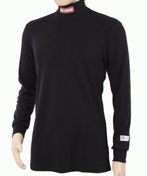 RaceQuip SFI 3.3 rated long underwear tops are knit from a blend of aramid and FRC fabrics to achieve a comfortable fire retardant garment. The properties of this unique fabric structure create a lightweight fabric that performs like Nomex® yet is much more cost effective. The Fire Retardant Cotton (FRC) component of the fabric promotes a soft and supple lightweight feel. Since it’s hypoallergenic, it won’t irritate your skin like some other materials tend to do. This proprietary fabric blend is also superior at wicking away mositure from the skin and dries quickly. Seams are flat sewn and strategically placed to avoid pressure points and promote comfort. All RaceQuip fire retardant underwear garments are machine washable and retain their shape well. This top is a long sleeve design with cuffs at the wrists and a mock turtle neck collar. Exceeds SFI 3.3 rating and is available in black children/youth sizes X-Small to X-Large – remember that racing underwear is designed and built to fit snugly.