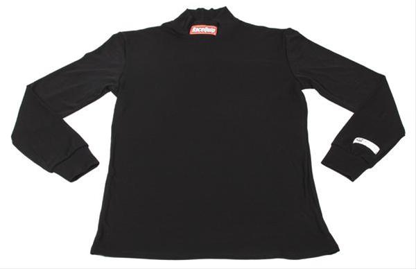 RaceQuip SFI 3.3 rated long underwear tops are knit from a blend of aramid and FRC fabrics to achieve a comfortable fire retardant garment. The properties of this unique fabric structure create a lightweight fabric that performs like Nomex® yet is much more cost effective. The Fire Retardant Cotton (FRC) component of the fabric promotes a soft and supple lightweight feel. Since it’s hypoallergenic, it won’t irritate your skin like some other materials tend to do. This proprietary fabric blend is also superior at wicking away mositure from the skin and dries quickly. Seams are flat sewn and strategically placed to avoid pressure points and promote comfort. All RaceQuip fire retardant underwear garments are machine washable and retain their shape well. This top is a long sleeve design with cuffs at the wrists and a mock turtle neck collar. Exceeds SFI 3.3 rating and is available in black sizes X-Small – 5XL – remember that racing underwear is designed and built to fit snugly.