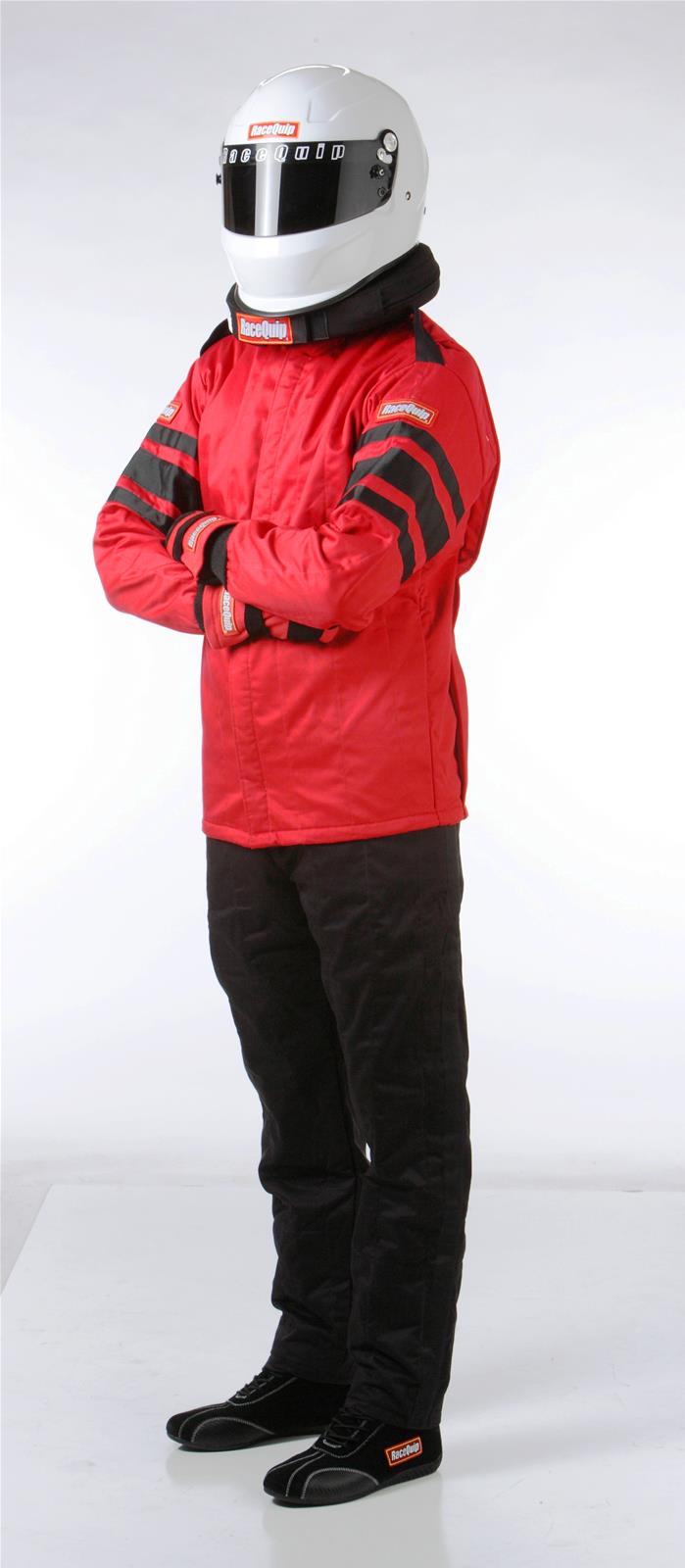 The RaceQuip 121 series multi-layer SFI-5 racecar driver’s fire suit jacket is made up of an outer layer of durable Pyrovatex® FRC, backed by a layer of Nomex®, then lined by another layer of Pyrovatex®. Note that sometimes these materials are referred to as “fireproof”, but actually all auto racing safety gear is “fire retardant”. Pyrovatex® offers the maximum combination of overall flame and heat protection, durability and comfort for the price. This fire retardant cotton based (FRC) material is used for the inner and outer layers because it retains the softness and breathability of cotton and will wick away moisture from the skin. Pyrovatex® fabric is gentle and non-irritating to even the most sensitive skin. The treatment process leaves the exterior surface shiny and supple. Since the Pyrovatex® process combines a chemical agent with the raw cotton fibers to create a bond at the molecular level, with proper care; the jacket will retain its flame retardant properties beyond the useful life of the garment. The middle layer consists of Nomex(R) batting which is an inherently fire retardant aramid fabric. All racing jackets are assembled with heavy-duty, multi-needle, over-lock safety stitch machines to provide exceptional seam strength. All RaceQuip jackets feature a high quality, heavy duty Nomex® backed brass zipper on FR tape installed with a double overlap for a more secure front opening. Stylish white armband stripes contrast with the full-length black leg stripes found on RaceQuip pants. The black accents: high-back collar, arm cuffs, and epaulets give RaceQuip driving jackets a unique look and style. Add to this the pleated back panel for freedom of movement and you have a multi-layer racing jacket that provides an outstanding value. Exceeds SFI 3.2A/5 specs with a TPP rating of 25. Available in Black with White stripes and also in Red or Blue with Black stripes. Manufactured in sizes Small – 5X-Large (refer to sizing chart).