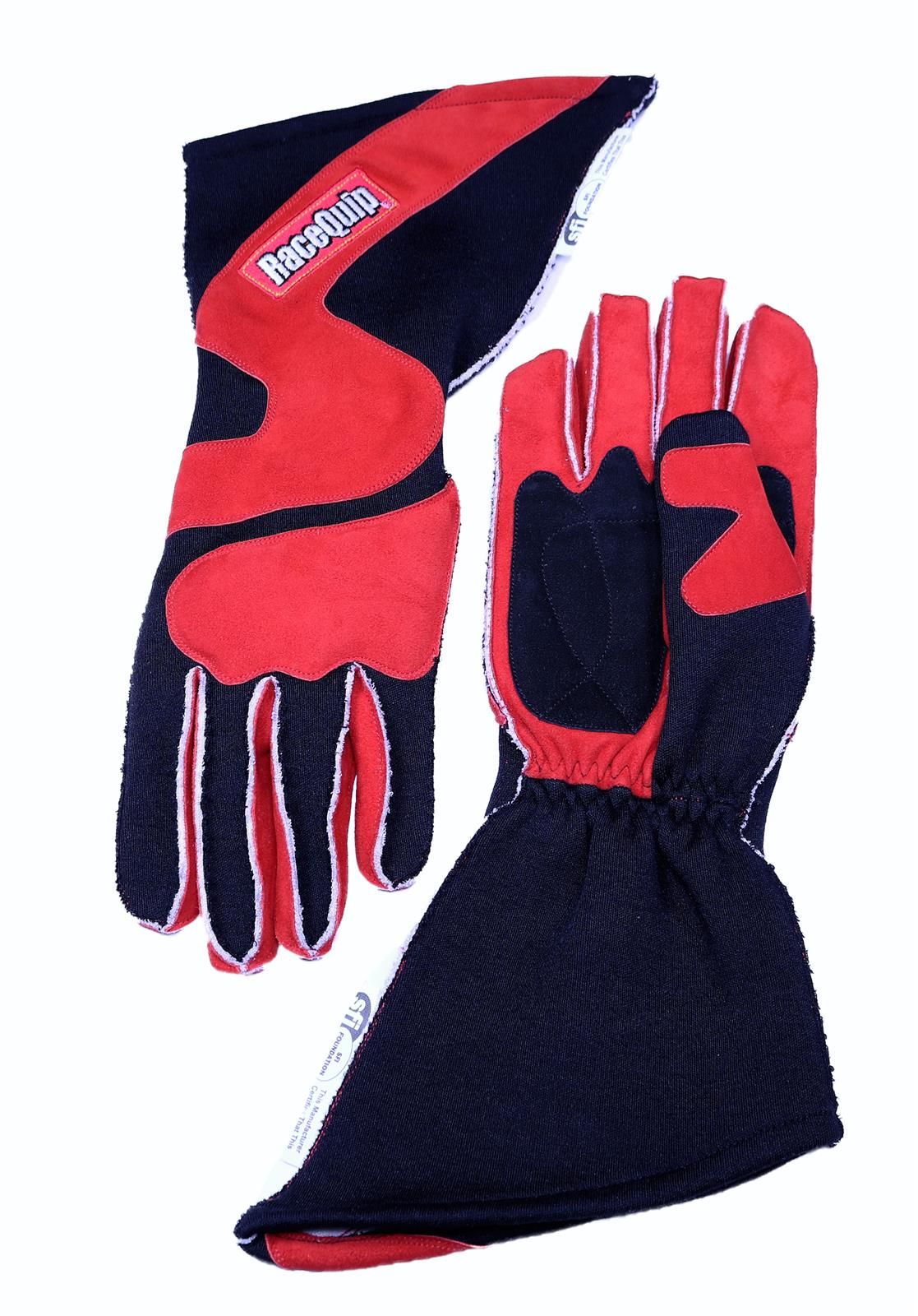 The RaceQuip 359 Series double layer outseam, angle cut gloves are constructed with two layers of knit Nomex® and exceeds the SFI 3.3/5 rating. The outseam, or reverse seam as they are sometimes called, have the seam on the outside for improved comfort and better feel on the wheel. These are the same style of glove that you typically see worn in the top levels like NASCAR, Indy Car, IMSA and others.The palms are a high grip, supple suede leather which also improves comfort and feel. An extra long angle cut gauntlet provides extra fire protection. Mitered fingers offer a more precise fit again increasing comfort and feel. Available in Red/Black and Gray/Black. Sizes: Small to 2X-Large